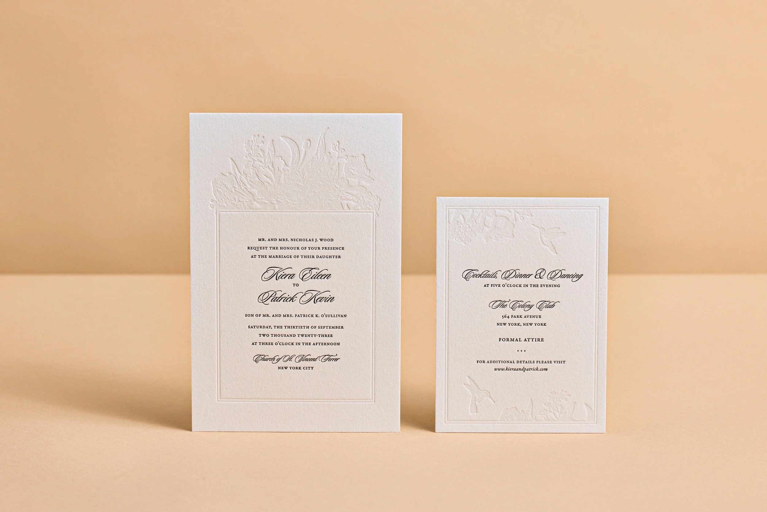 Oversized letterpress wedding invitations for Kiera and Patrick’s fall wedding in NYC. We pressed tined white and black inks on thick 600g Lettra paper. Blind letterpress is an option here too, but the tint really helps the detail pop on the paper.